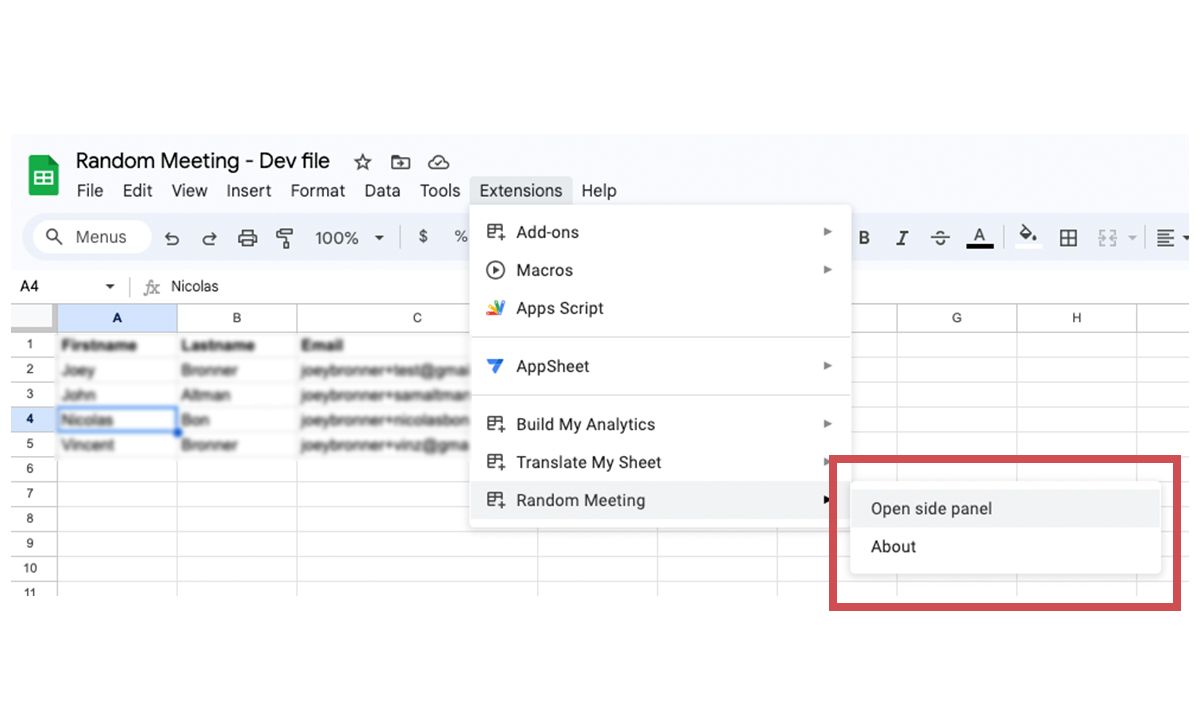Launch the side panel in the top bar: Extensions > Random Meeting > Open side panel.