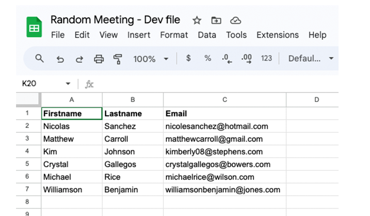 Column A = Firstname, Column B: Lastname, Column C: Email