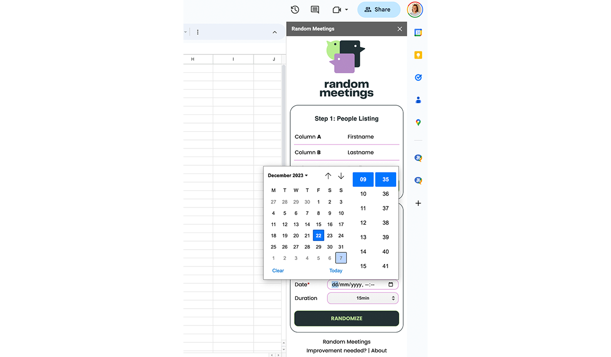 Fill meeting info, select a date and a time, and click on "Randomize"